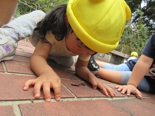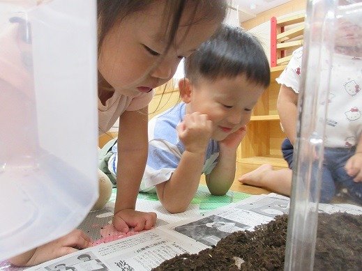 夕方まで保育室で観察しながら過ごします。これは、カブトムシの幼虫を見ている写真です。こんなに優しいお顔で見つめられる虫さん達は幸せなんじゃないかなと思っています。