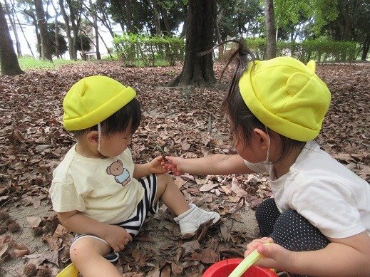 はい、どうぞ。見つけた木の実をプレゼント。お裾分けをしたら、いいものを見つけた嬉しい気持ちが広がったかもしれませんね。
