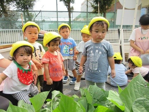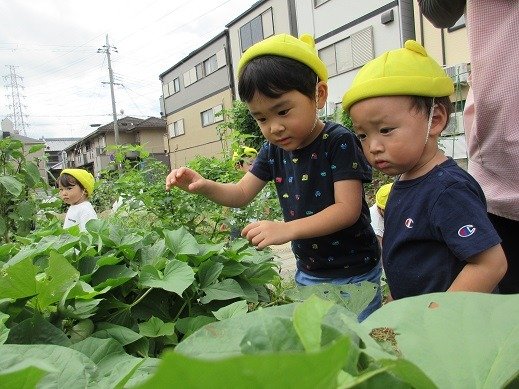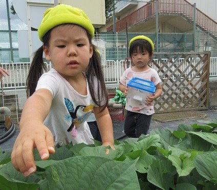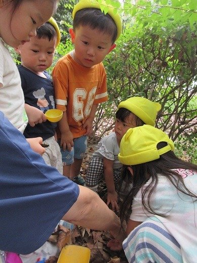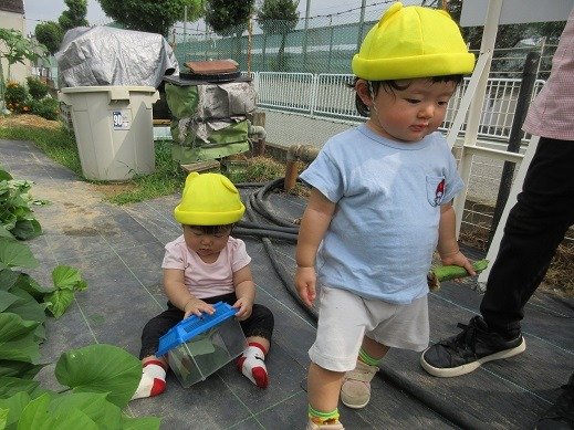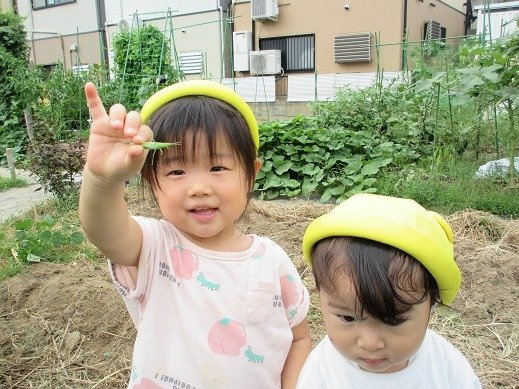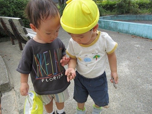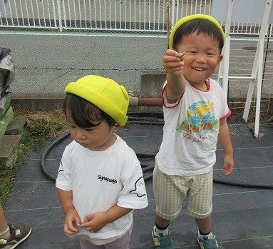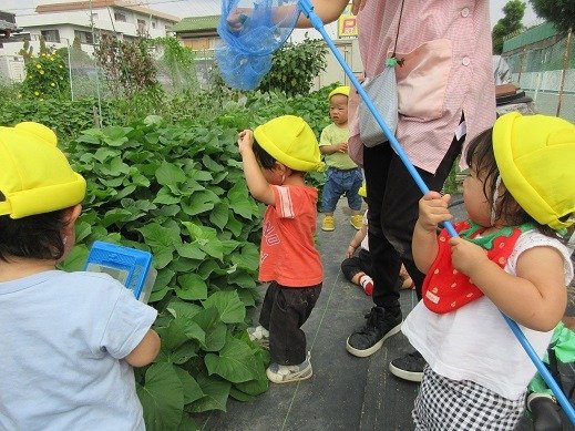 畑ではバッタを捕まえました。公園ではダンゴムシを。虫を触るのが平気なお友達が多くて力加減も上手です。