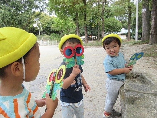 この日は製作で作ったとんぼの眼鏡を持って公園に行き、眼鏡を通して見る赤い世界や青い世界、緑の世界を楽しんでいました。