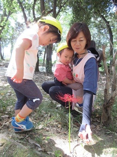 彼岸花も見つけました。絵本『きんいろあらし』の中で、かめきちおじいさんの横に彼岸花が咲いているページがあります。お部屋に貼っているので、散歩のたびに見つけたいです。(毒があるので注意してくださいね)