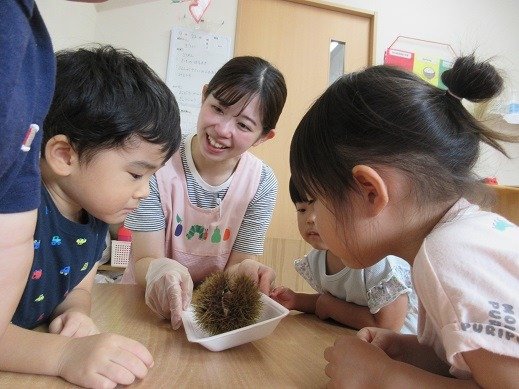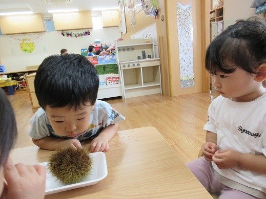 秋と言えば、「栗」好きな方も多いのではないでしょうか。大きな丹波栗をじぃ~っと見つめ「いつも公園で拾う木の実と違うね」なんてお話をしました。栗のイガはお茶にすると美味しいそうです。やってみたい方!また感想を聞かせてください。私もやってみます。