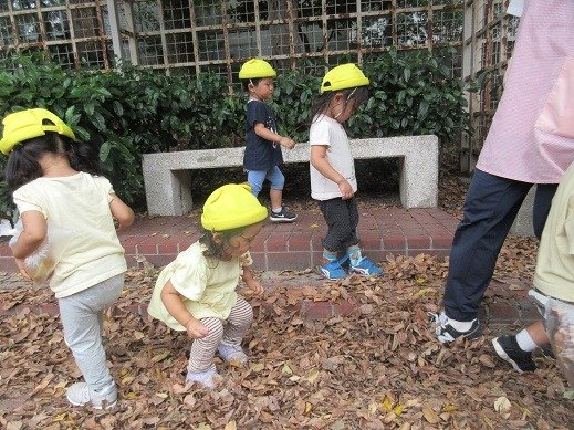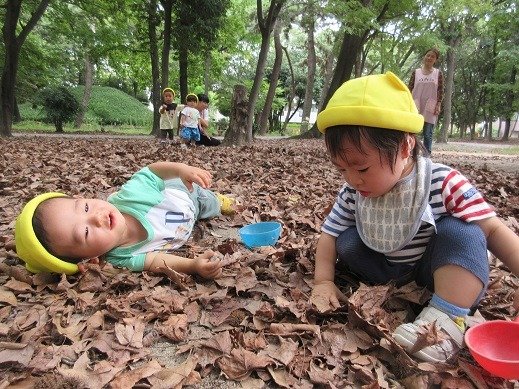 転んでもフカフカの落ち葉が守ってくれます。ごろり~んと寝転がると、ガサガサという音がしておもしろくて、転んだびっくり顔も、すぐに笑顔になりました。