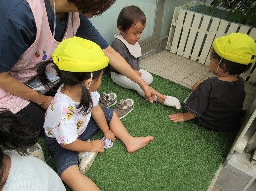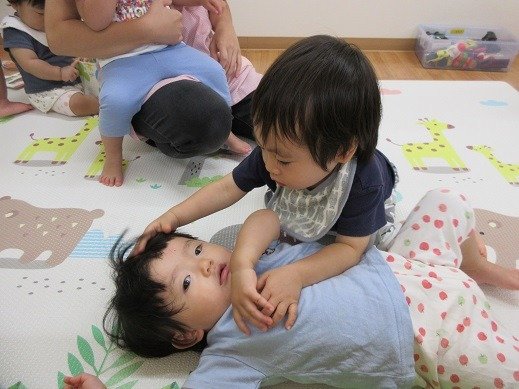 お友達が寝転がっていたら、ヨシヨシと頭を撫でておなかを優しくトントン。わらべうた遊びは友達との関わり方の学びの一つにもなっているようです。
