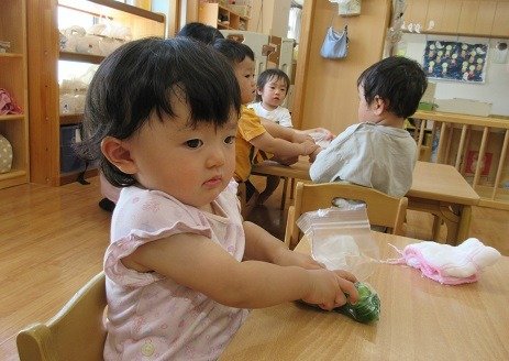 畑に行くとバッタがいっぱいいて、くま組さんが器用にバッタを捕まえてくれます。眉を寄せて、ちょっぴりドキドキしながら…エイ。