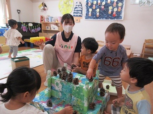 絵本『くさむらむらのおつきみまつり』に描かれている植物と虫の世界観は、子ども達がいつも遊んでいる世界にぴったり。お部屋に絵本の場面を貼っておいたので、子ども達が指をさしてじっくりと見ている姿が見られます。ほおずきの提灯や、葉っぱで作ったやぐらも、おみこし作りのイメージになっていくかもしれませんね。