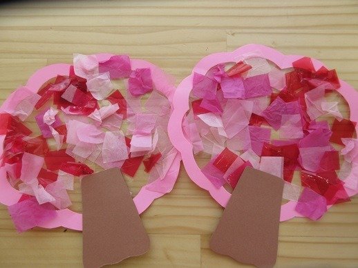 ピンクのセロハンやお花紙をヒラヒラ散らせて桜を作りました。