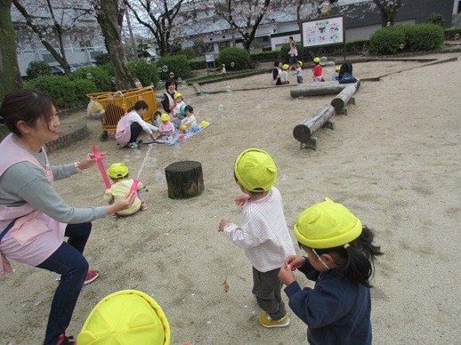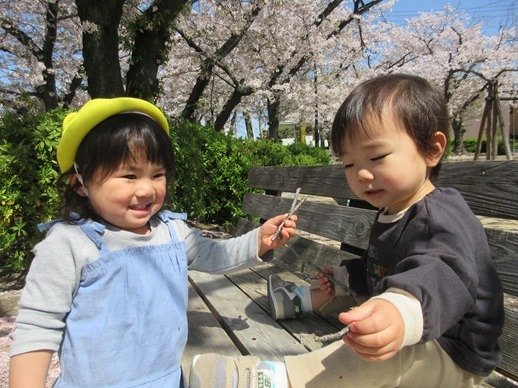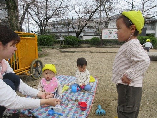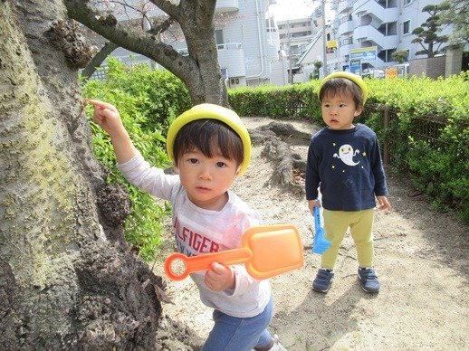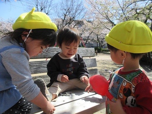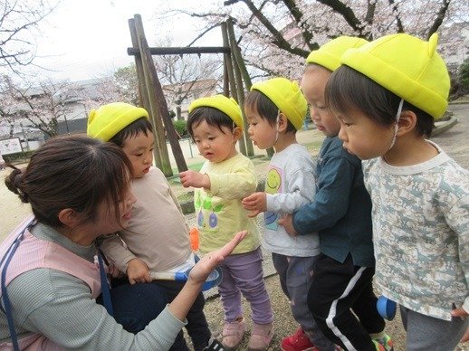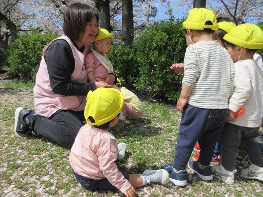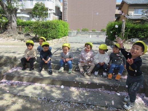 「ふ~」ひらひらと舞う桜の花びら。ひよこ組さんにも見せてあげると、じーっと見て不思議そうなお顔。
