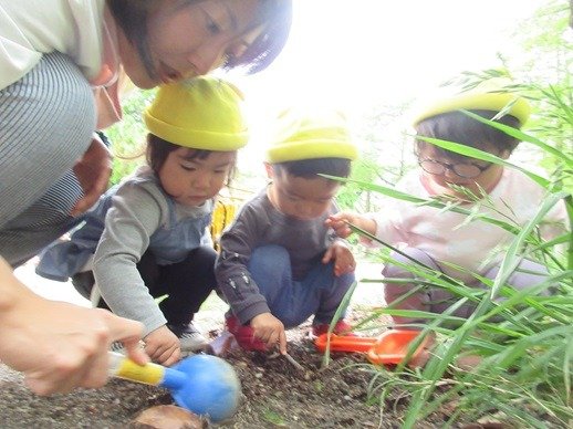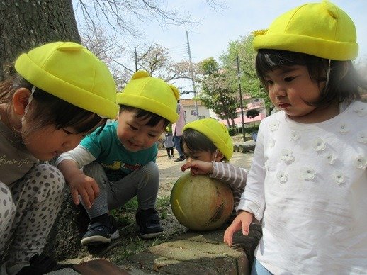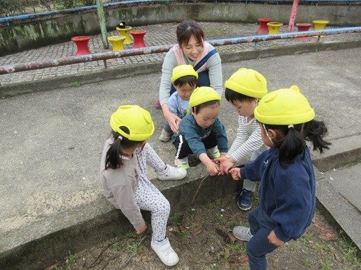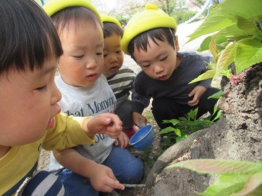 ダンゴムシもいたよ!「どこどこ?」みんなで覗き込んでダンゴムシの観察。今日も出会えたね。ダンゴムシさんに。