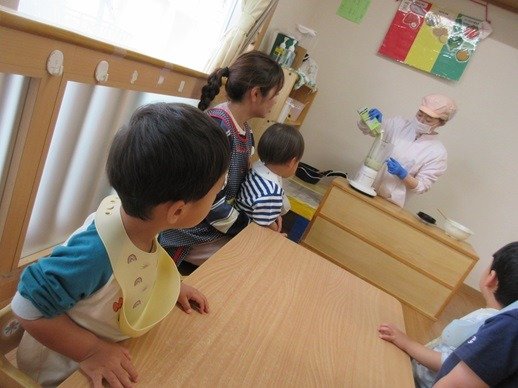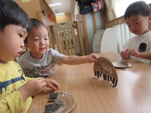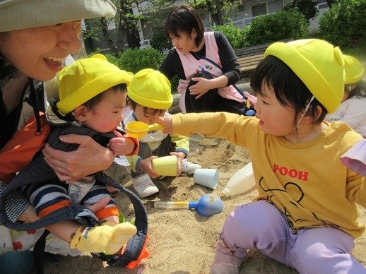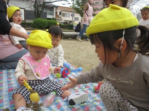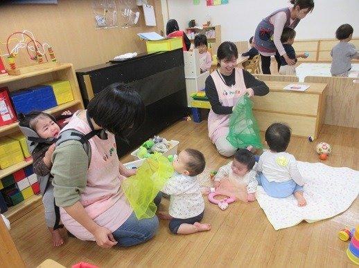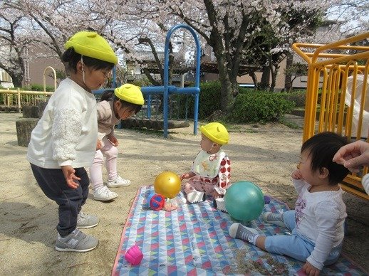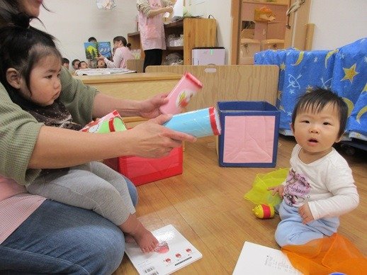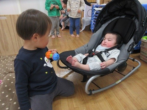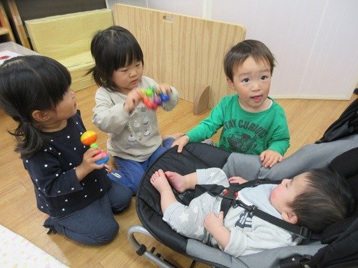 赤ちゃんが泣いているとおもちゃであやしたり、とっても上手なんですよ。「やさしくね、そうそう、なでなでね」お兄ちゃんお姉ちゃん達のしてあげたい気持ちが嬉しくてかわいくて、もう、たまりません♪