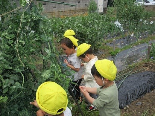 バケツの中はスナップエンドウでいっぱいになりました。これぐらいあればみんなの分もあるかな?