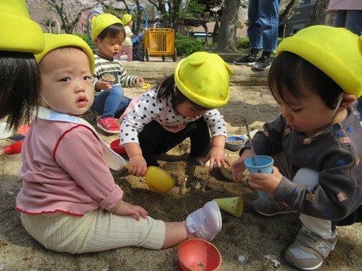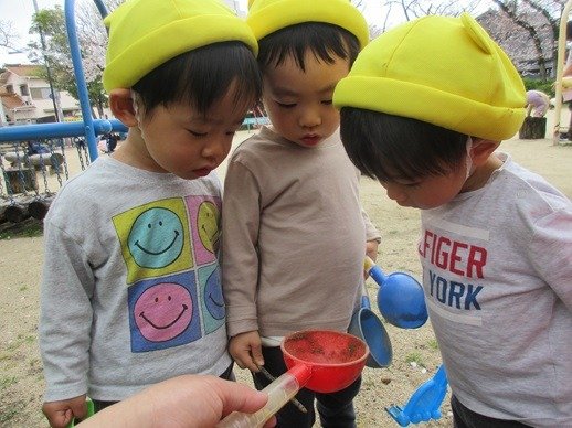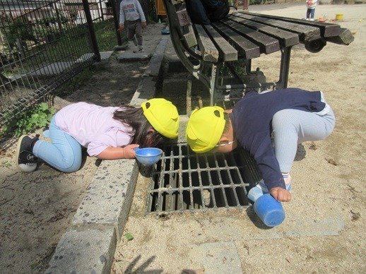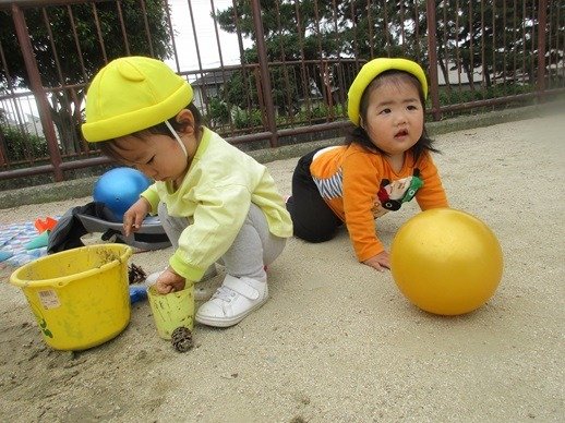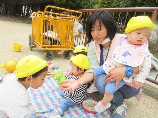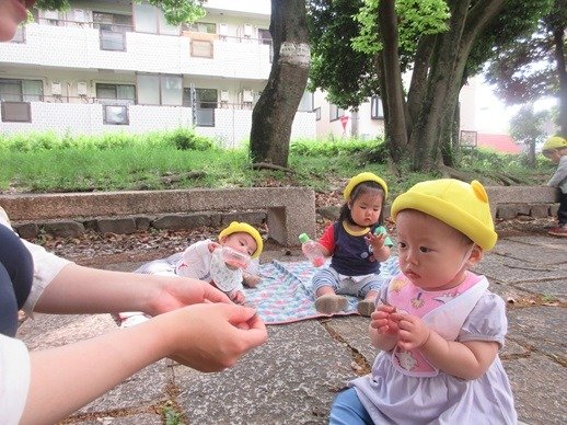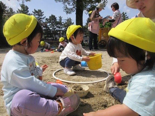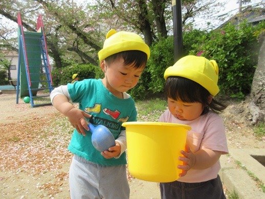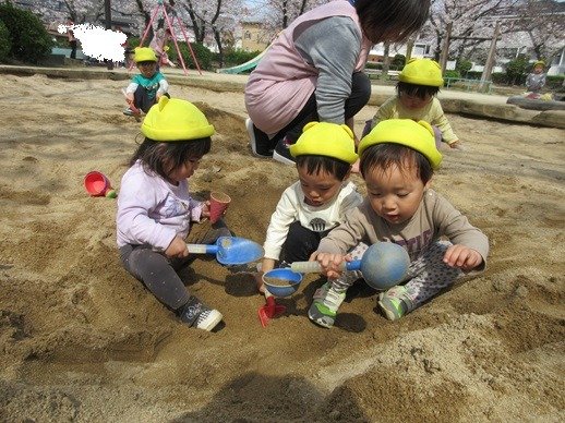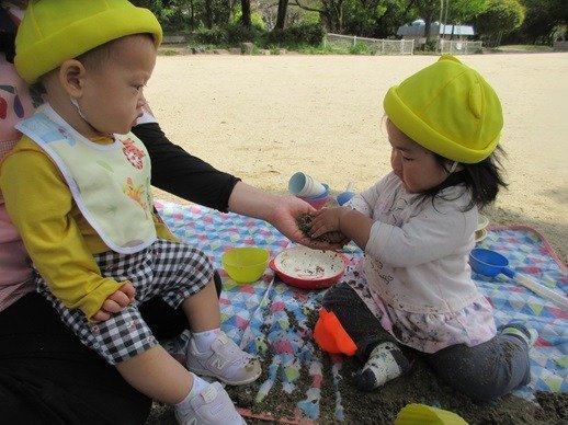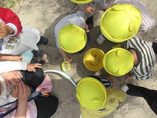 お水を入れて、泥んこ遊びも楽しいね。新入園児さん達も、外遊びが大好きで、先生の膝から降りて安心して遊べるようになりました。
