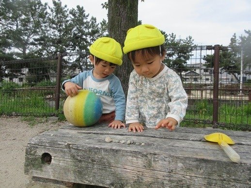 相変わらず虫探しに夢中ですよ。ダンゴムシは手のひらいっぱいに集めて大事に握りしめていたりします。保育室にダンゴムシが歩いていることも。誰かのポケットからでてきたのかもしれませんね。笑
