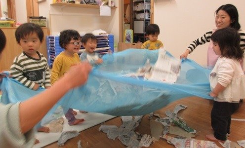 雨の日は新聞紙で、思いっきり体を動かして遊びました。あつめてのせて、♪うえからしたからおおかぜこい♪