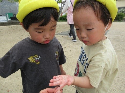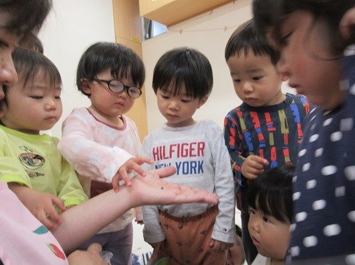 「みてみて」「なぁに?」の数珠繋ぎ。虫が苦手なお友達も、触れるお友達をみて、手のひらにのせてもらおうとしたり、チャレンジしています。自分もやってみたい!という気持ちがかっこいいね。