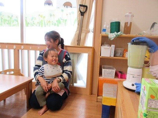 ミキサーのガーーーーッという音がなると、楽しくなってニッコニコです。