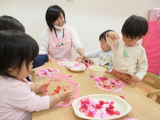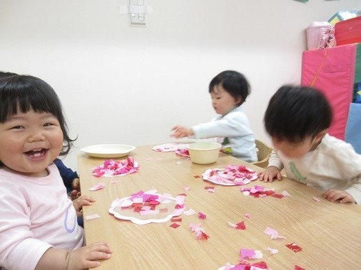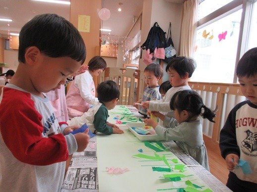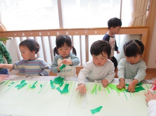 緑色の折り紙をビリビリペタペタ。何ができるのかな?