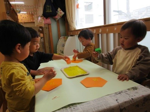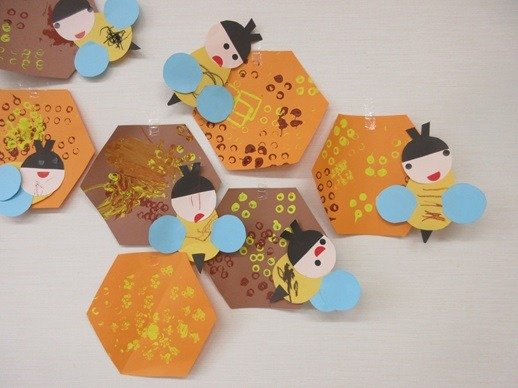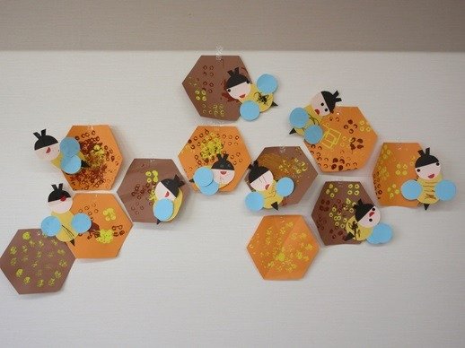 ブロックでスタンプをして作ったのは、ハチの巣と蜂さん。