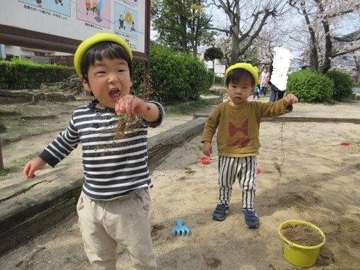砂場に大きな穴が掘ってあったのを見つけ、みんなでどぼ~ん。寝転がったり、滑って穴に入ったり、足だけ突っ込んでみたりと、砂まみれになって遊ぶ子ども達。イキイキしたお顔していて、これぞ、子ども!と嬉しくなります。お洗濯は大変だと思いますが…。どろんこになって遊べる季節になったのも嬉しいです。