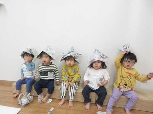 新聞紙で作ったかぶとの帽子も良く似合ってかわいいでしょ?