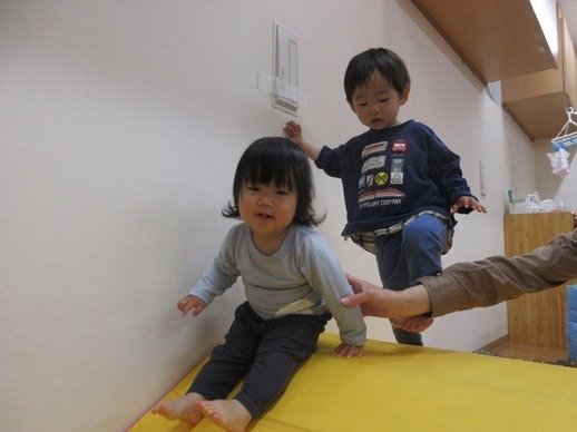 雨の日はお部屋にマットや滑り台をだして遊びました。ワクワクしながらお約束を聞いて