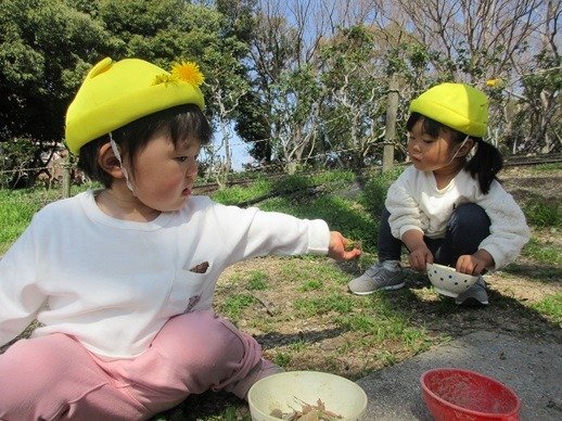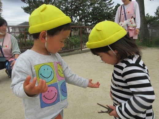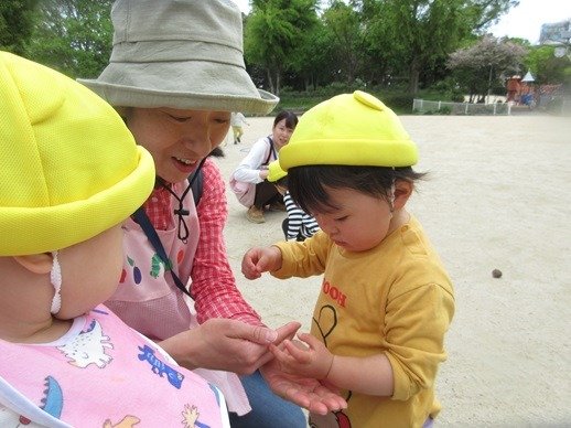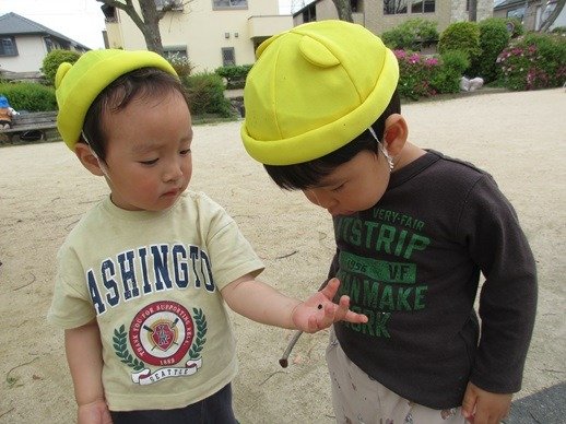 公園に行くと子ども達は虫を探すのですが、居場所をよく知っているんですよ。虫だけでなく、よいサイズの枝や小石を見つけるのも得意です。明日もいいものみつけようね!