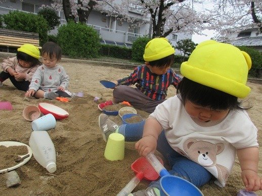 泣いていたお友達も砂場にいくとおもちゃや砂に手を伸ばして遊び始めます。時々思い出して涙もでちゃうけど、がんばっていますよ。