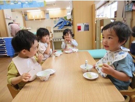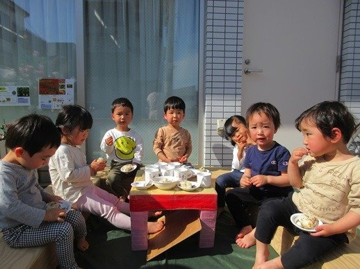 くま組さんは3時のおやつを外で食べましたよ。おにぎりと煮干し。煮干しはポリポリと噛むおやつにピッタリで、子ども達にも好評なおやつですよ。