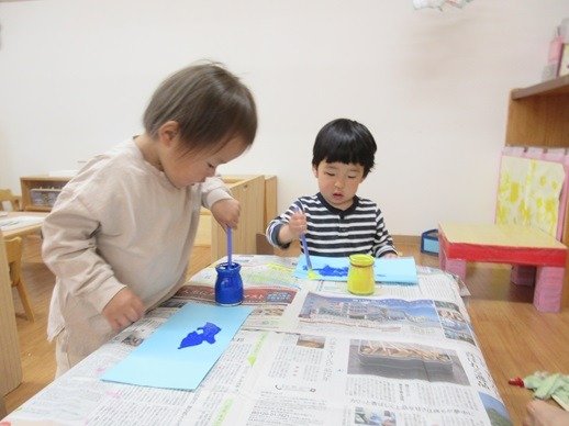 雨だった日は、粘土や絵の具遊びもしました。新しくチームになったお友達ともすっかり仲良しです。
