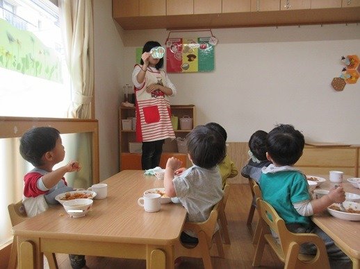 みんなの給食に入っているものは体の何になるのかな?給食の中にあるきのこを見つけて「病気から守ってくれるんだって♪」おいしく食べながら、食材に興味を持ってほしいです。苦手なものでも知っている食材にしよう!と給食の時間を過ごします。