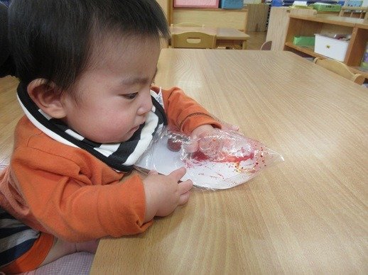物をつかんでニギニギしていると、絵の具が画用紙についていきます。指先の運動をしながら感触を楽しんで、世界に一つしかないアート作品のできあがり!初めての物に触れたり、五感を使って遊んだ”あと”を作品にして残しています。