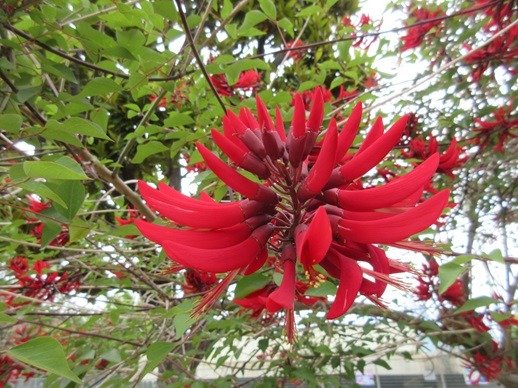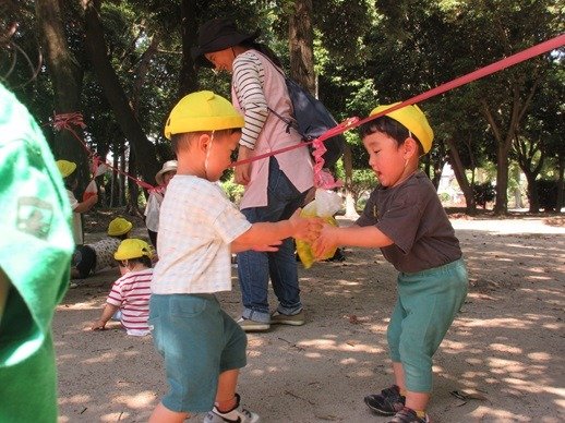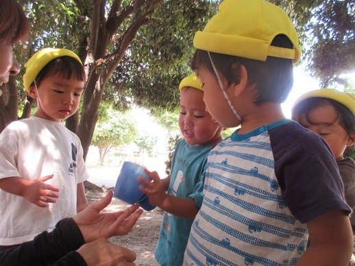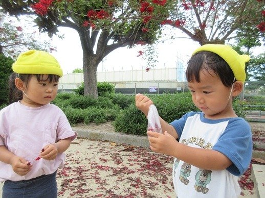 公園に咲いていたデイゴの花びらを集めて色水遊びをしました。モミモミしていると、透明の水がきれいな赤色に変わっていくのが不思議そうでしたよ。