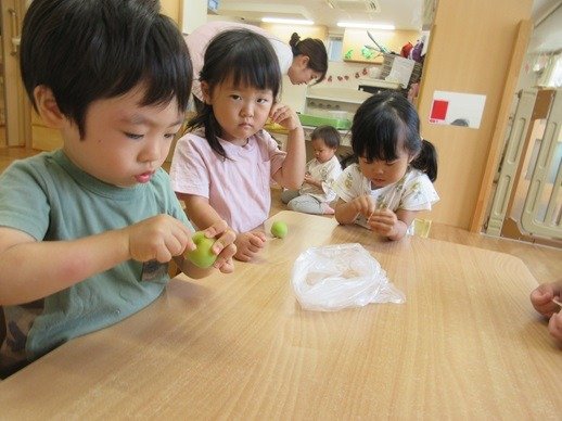 毎年恒例の”梅シロップ作り”をしました。難しそうなお手伝いですが、とっても器用につまようじを使って、くるりんとヘタの部分を取ってくれました。