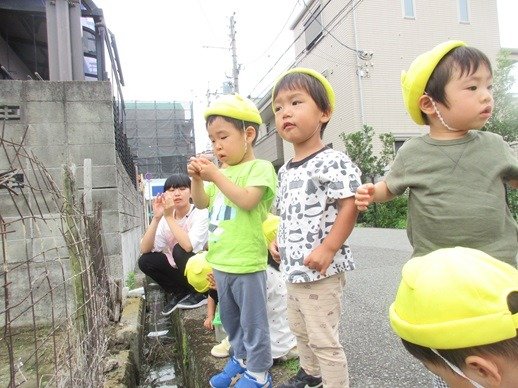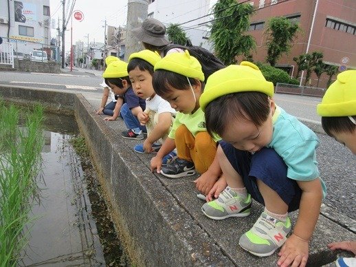 公園に行く途中でカエルさんがいるかな?とたんぼを覗き込み「かえるさ~~~~ん」と大きな声で呼びます。いたいた!先生が捕まえてくれたカエルさんは、みんなが知っているカエルさんとはちょっと違っていたんです。