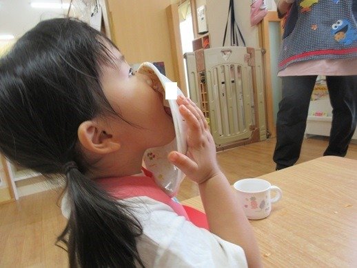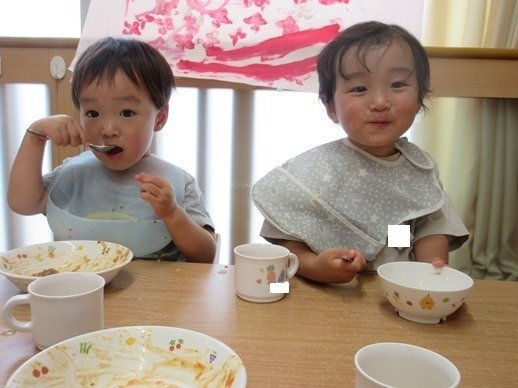 しっかり外で遊んで保育園に帰ってくると、給食室からおいしそうな香りがしてきて、おなかがすいたスイッチオン!「おいしー」「おかわり~」とみんなおかわりをして食べます。