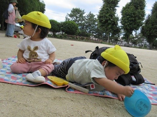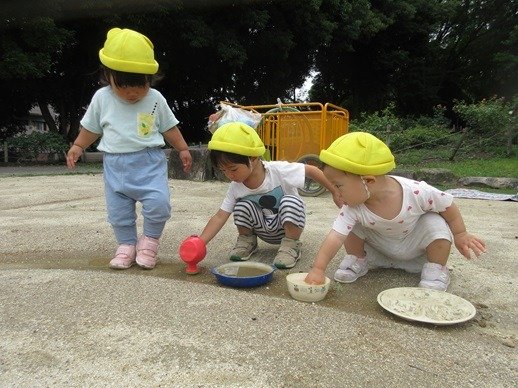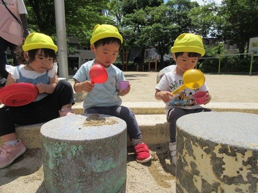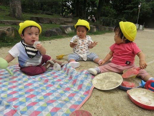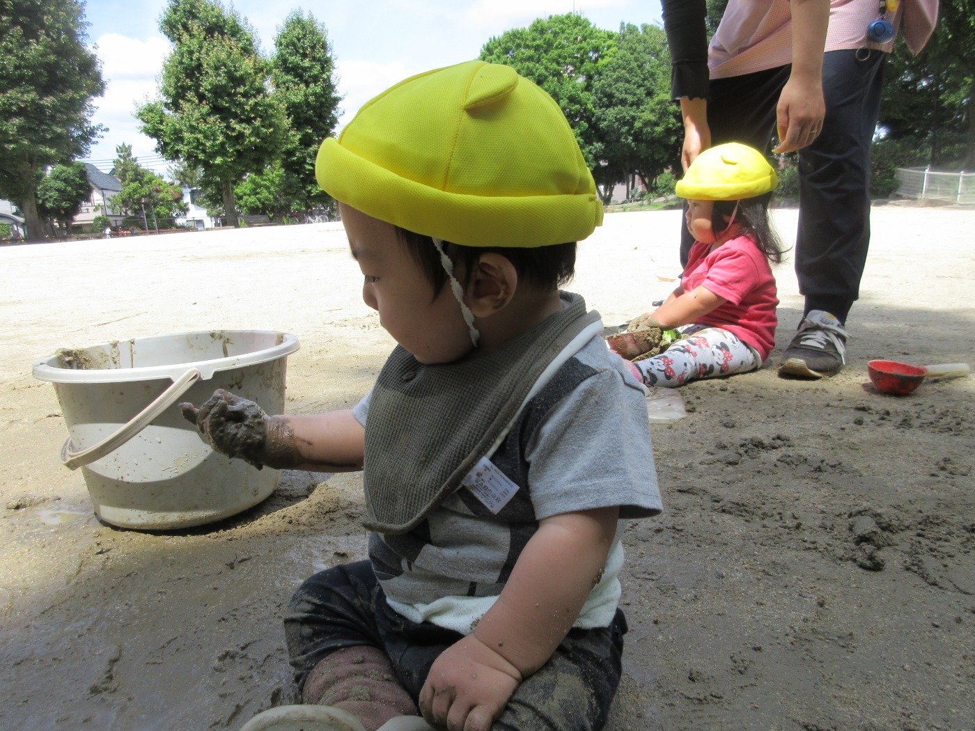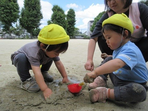 ひよこ組さんも砂を触ったり泥んこに手を伸ばしたり、みんなの遊んでいる様子をよく見ています。