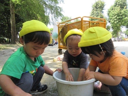 ぎゅーっと押すと、水がチョロチョロと出てきたね。こんな風に遊びながら、子ども達は力加減や不思議を体験していくんですね。