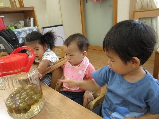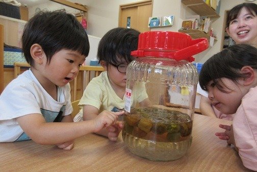 梅、氷砂糖の順番に入れるのもお手伝いしてもらいました。瓶をゆすってできあがるのを楽しみにしています。