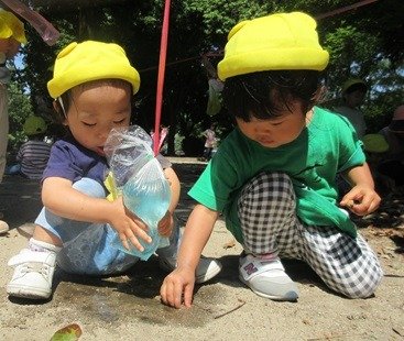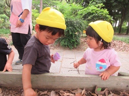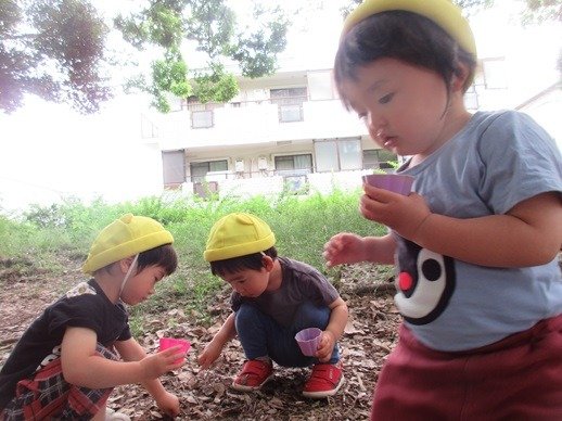 容器を持ってダンゴムシ探し。「いたよ!」の声や仕草に「どこどこ?」と覗き込むお友達。