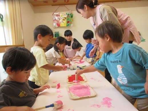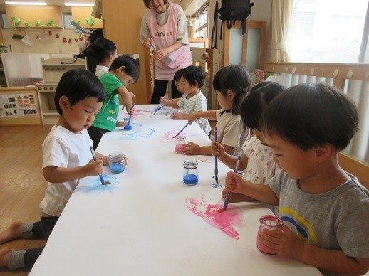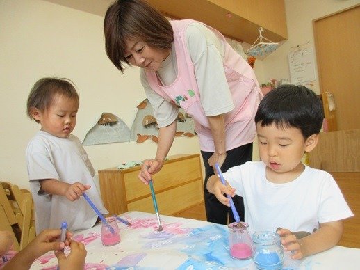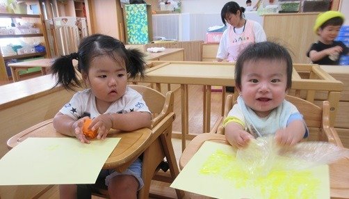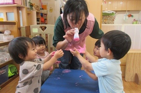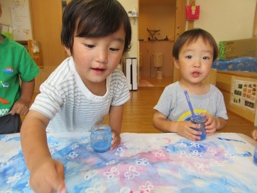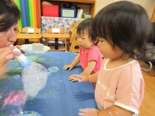ブクブクとでてくる泡におおはしゃぎ。両手に泡をのせて画用紙にぺたり。泡を叩いたり広げてみたりと、いつもとはちょっと違う絵の具遊びを楽しみました。雨の日もお部屋で楽しい遊びをたくさんしたね。