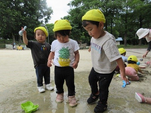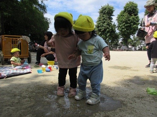 バケツに水を入れて遊んでいるうちにできた水たまり。どろんこが大好きな子ども達はスコップや容器を使って泥んこ遊びを堪能しました。バシャバシャと水たまりに入るのも楽しいね。