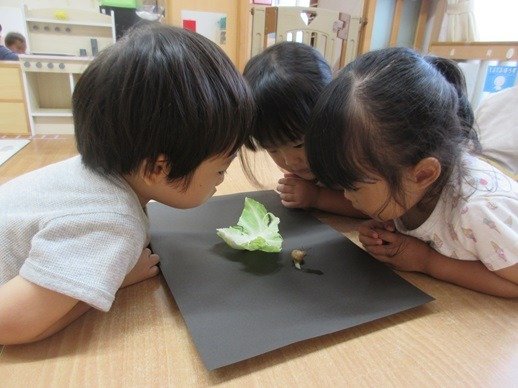 黒い画用紙の上にカタツムリをのせると、通ったあとが濡れてキラキラ。キャベツを小さくちぎって口元に運びながら、食べるかな?と期待いっぱいです。どんどこどんどこちぎってあげるものだから、最後にはキャベツでカタツムリが包まれてしまいました。途中でカタツムリが潤ったようで「おしっこした!」なんて声も。