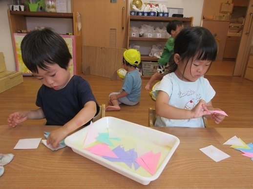 もうすぐ七夕なので飾りも作っていますよ。指先につけるノリの量を加減しながらつないでいくのはなかなか難しいんです。こんなこともできるようになったのね!製作の工程にも成長を感じて嬉しくなります。