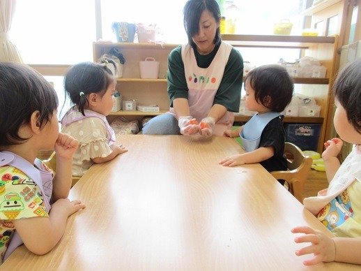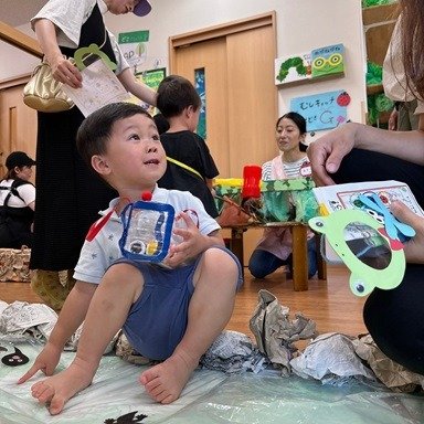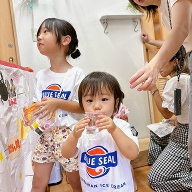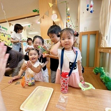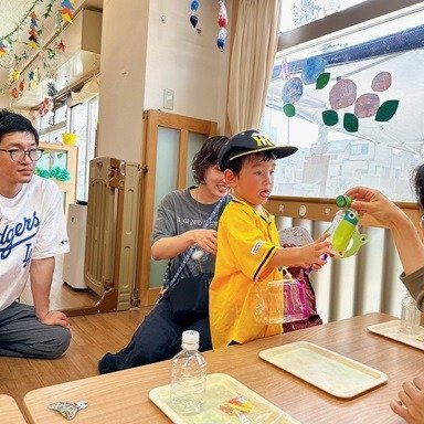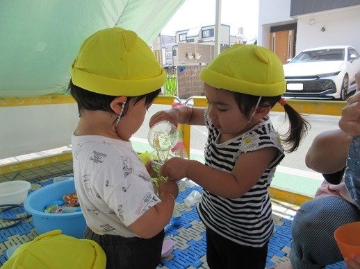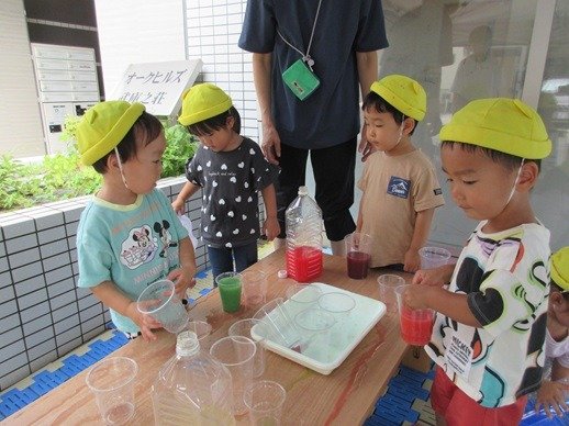 先日のお楽しみ会では、色水を使ったジュース屋さんのお話でした。その後、水遊びで色水を出すと、自分で色を混ぜてみて、「オレンジジュースができたよ」「これはぶどう」と、色作りを楽しみ始めました。「いろいろ混ぜたら汚くなったから捨てた」と苦笑いしながら教えてくれたのも新鮮でした。