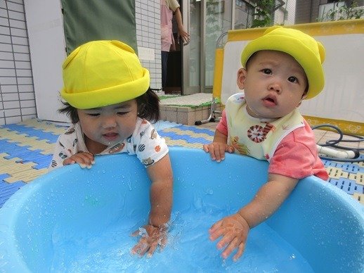 タライのお水に手を入れてパシャパシャと水しぶきを楽しみます。気持ちいいね!