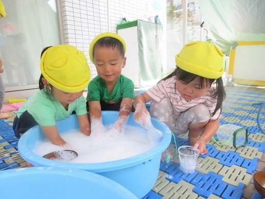 泡遊びも大好きです。泡をすくって集めて柔らかい感触を楽しんでいますよ。