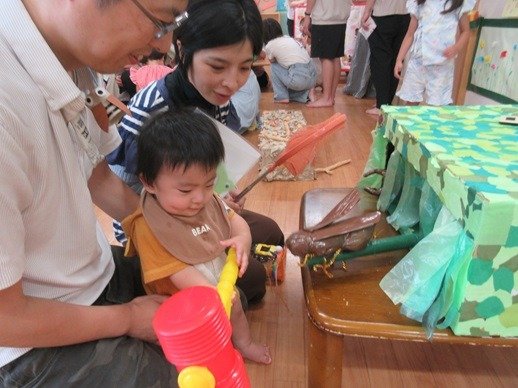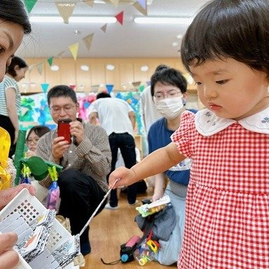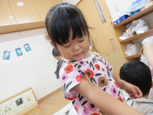 テントウムシを貰って虫かごにポトン。できたー♪と、拍手で喜んだり、完成したマラカスも入れちゃおう~なんてニヤニヤして、かわいいですね。