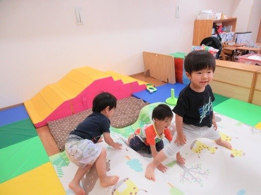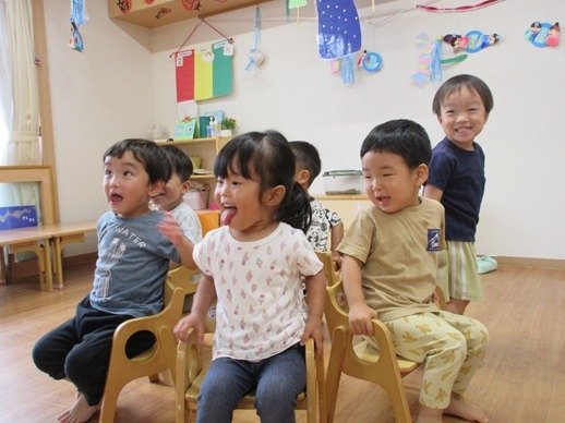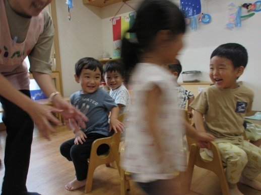 くま組さん達は簡単なルールのあるゲームもできるようになりました。”いすとりゲーム” 追いかけられる緊張感と期待でとってもいいお顔。