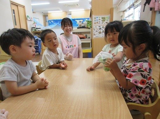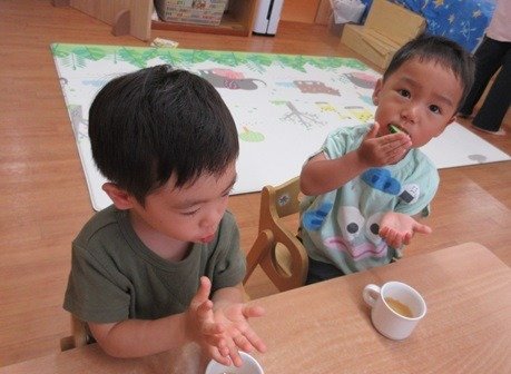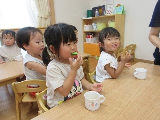 美味しくておかわりしたいので急いで食べようとしているお友達に「まだあるから大丈夫よ。よく噛んでね」と言われ、ホッとした表情。この夏、まだまだとれそうなので、何度も子ども達と作りたいです。
