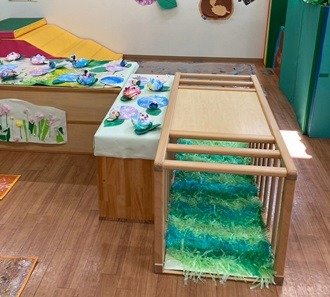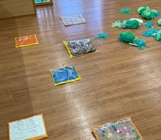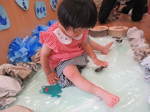 床には小麦粉粘土や保冷剤など違った感触と、押すと音が鳴るテントウムシも貼り付けて感触遊びのコーナーを作りました。